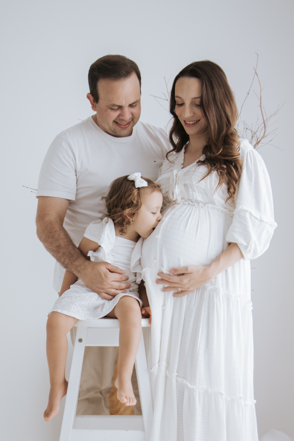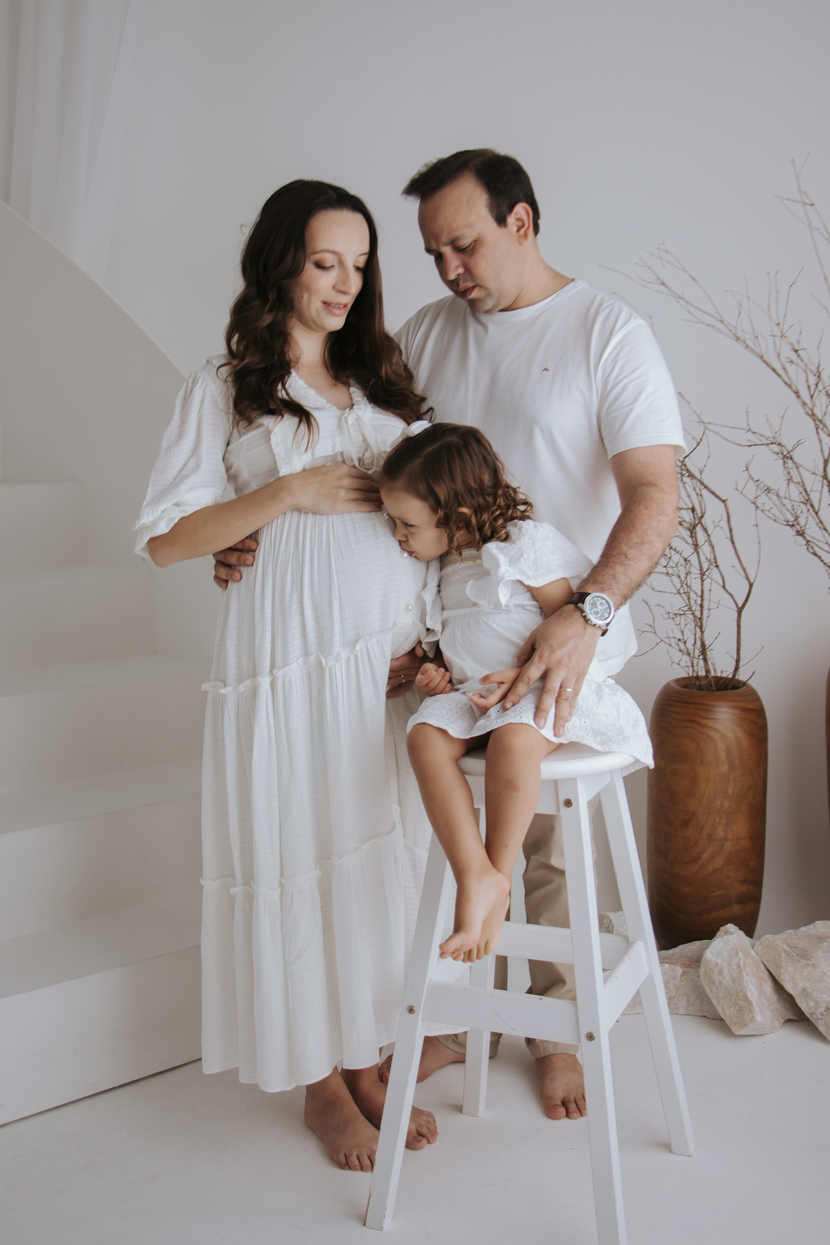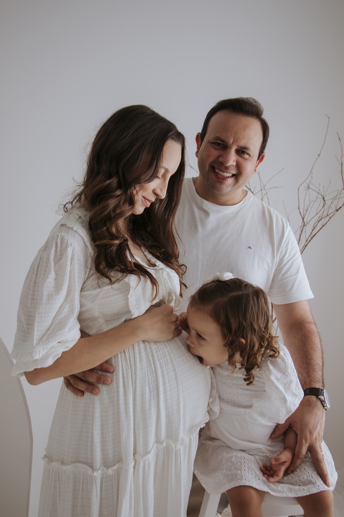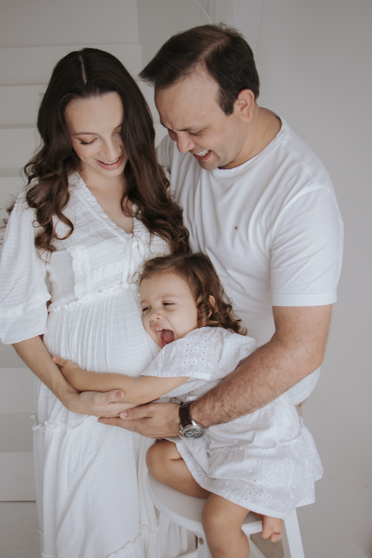 A Júlia, filha mais velha, já se preparava para seu novo papel de irmã. Durante a sessão ela contou segredos para o Isaias, fez cosquinha na barriga e disse que quando o irmão nascesse os dois iriam fazer muita bagunça por aqui.